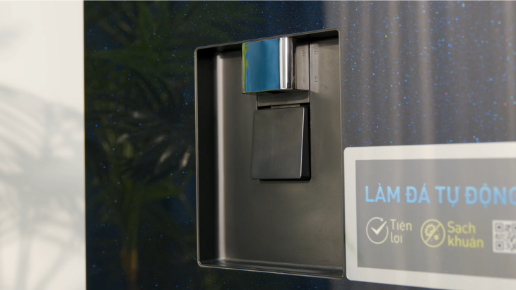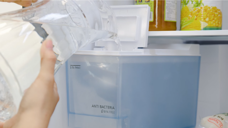 Ngoài ra, ngăn lạnh còn được trang bị bình chứa cho vòi lấy nước và hệ thống làm đá tự động. Các bình chứa đều được làm bằng chất liệu nhựa không chứa BPA an toàn cho sức khỏe, cùng với bộ lọc carbon khử mùi hôi, kháng khuẩn hiệu quả. Cả 2 bình chứa này đều có thể tháo ra để vệ sinh khi cần thiết.
