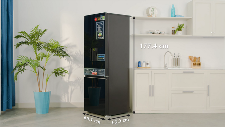 Kích thước của tủ với chiều cao 177.4 cm, chiều rộng 60.1 cm và chiều sâu 63.9 cm phù hợp với hầu hết các không gian bếp từ trung bình đến rộng lớn.