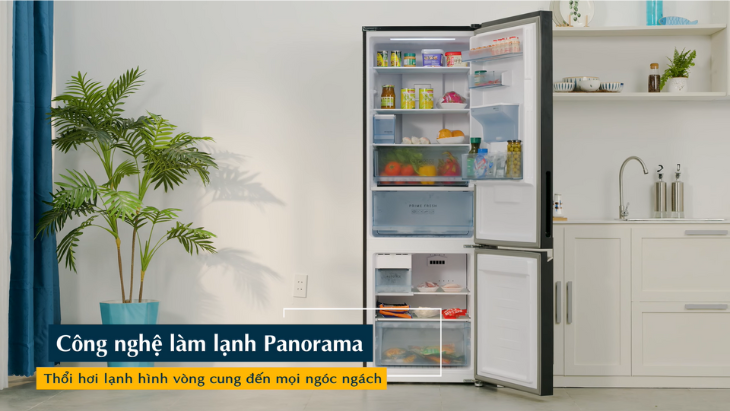 Tiếp theo, phải kể đến công nghệ làm lạnh vòng cung Panorama giúp luân chuyển không khí lạnh đến mọi ngóc ngách của tủ. Dù có sắp xếp thực phẩm với số lượng lớn hay chỉ là một vài món đơn giản, tủ lạnh vẫn duy trì được hiệu suất làm lạnh tối ưu. Đây là một yếu tố quan trọng giúp kéo dài tuổi thọ của thực phẩm và tránh lãng phí không đáng có.
