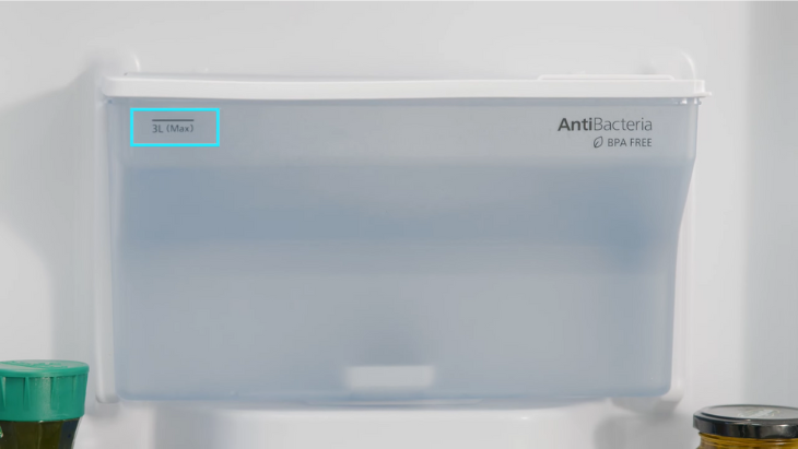 Bình chứa cho vòi lấy nước nằm ở cửa tủ có dung tích 3 lít