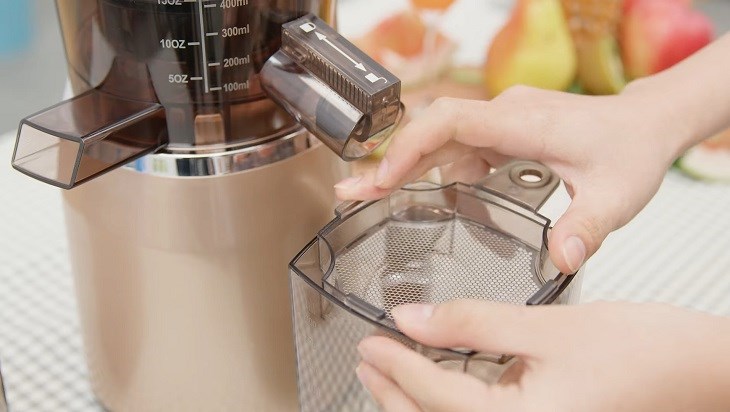 Cốc chứa nước ép có dung tích lên đến 1000ml trang bị thêm rây lọc gắn khớp vào miệng cốc, giúp giữ lại toàn bộ bã mịn ngay khi nước ép vừa ra khỏi máy, bạn sẽ không cần tốn thêm một bước lọc nước qua rây trước khi sử dụng hoặc phải dùng thêm rây rời bên ngoài. Đây là một chi tiết rất nhỏ nhưng không phải sản phẩm máy ép trái cây chậm nào cũng tặng kèm theo, rất phù hợp với những bạn không thích uống nước ép còn lẫn bã rau củ, trái cây lợn cợn.
