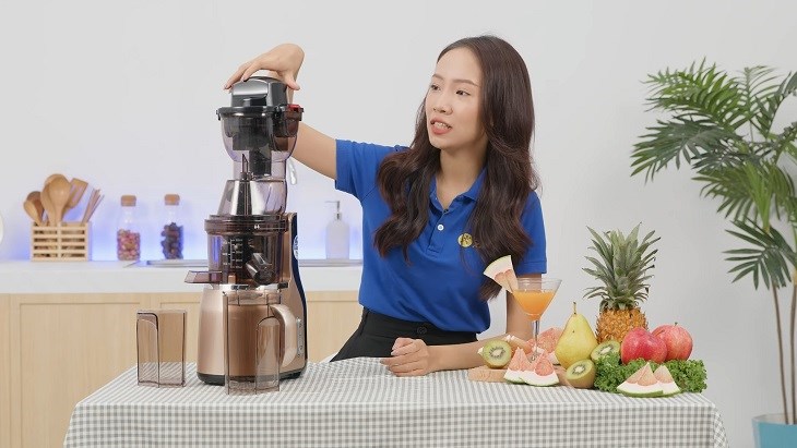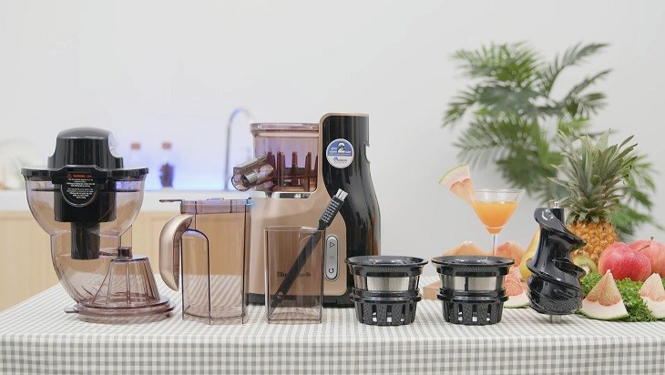 Tổng thể bộ máy ép bao gồm 1 thân máy, 1 cốc chứa bã ép, 1 cốc chứa nước ép kèm theo rây lọc bã, 2 loại lưới lọc riêng biệt, 1 thanh nhấn, nắp đậy và 1 bàn chải để vệ sinh máy. Máy có trình tự tháo lắp rất đơn giản, dễ thao tác và đặc biệt chỉ hoạt động khi tất cả các khớp máy đều lắp vào đúng chỗ.