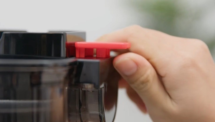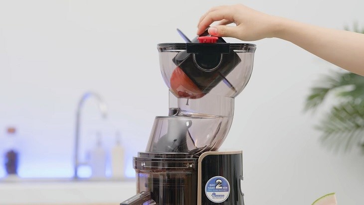Để cho nguyên liệu cỡ lớn (ví dụ như một trái táo) vào máy, bạn chỉ cần rửa sạch nguyên liệu rồi đặt vào vị trí, mở chốt màu đỏ bên trên ống tiếp nguyên liệu để xoay toàn bộ phần nắp đẩy nguyên liệu xuống dưới là xong.