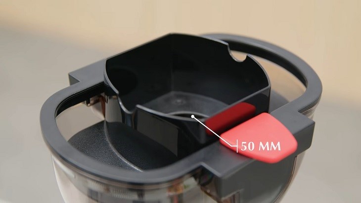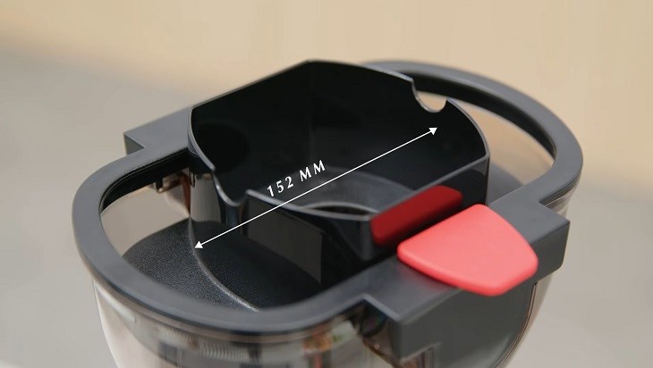 Cửa tiếp nguyên liệu nhỏ của máy có kích thước 50mm, cửa lớn là 152mm, không quá lớn so với các loại máy ép chậm khác nhưng thiết kế rất linh hoạt thông minh. Thiết kế này giúp chúng ta ép được các loại trái cây kích thước lớn (như táo, lê, ổi, cà chua…) mà không cần cắt nhỏ chúng ra, tiết kiệm được kha khá thời gian sơ chế.