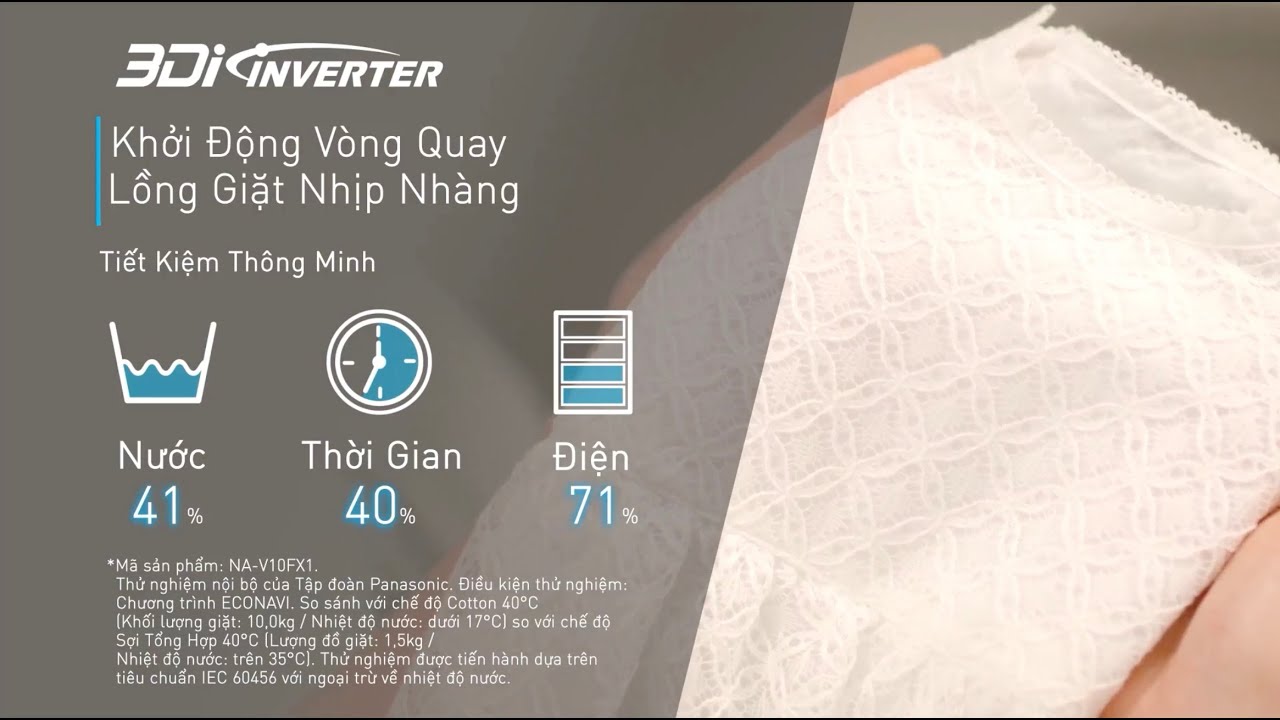 Động cơ 3Di Inverter tiết kiệm đến 41% nước, 40% thời gian, 71% điện so với chế độ giặt thông thường, mang đến giải pháp sức khỏe thông minh, chăm sóc quần áo của bạn.