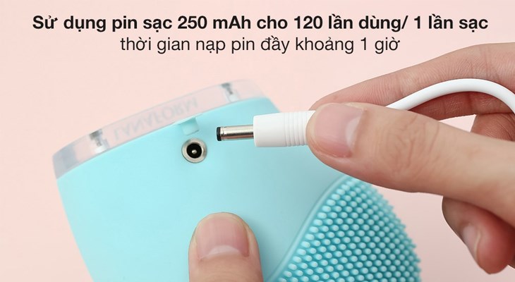Máy rửa mặt Lanaform sở hữu viên pin sạc 250mAh, cho phép người dùng sử dụng lên đến 120 lần