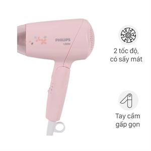 Máy sấy tóc 1200W Philips BHC010 có vẻ ngoài nhỏ gọn với tông màu hồng xinh xắn, đáng yêu, phù hợp với các bạn nữ có nhu cầu hong khô tóc và tạo kiểu tóc tại nhà. Thiết kế tay cầm có thể gấp gọn, giúp người dùng dễ dàng cho vào vali, túi xách, balo,... khi đi du lịch.