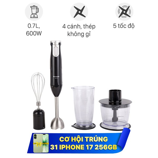 Máy xay cầm tay Panasonic này là sự lựa chọn hoàn hảo cho những ai yêu thích sự tiện lợi và hiệu quả trong bếp. Với công suất 600W và lưỡi dao bằng thép không gỉ, máy xay nhuyễn mịn mọi loại thực phẩm, từ rau củ, trái cây đến thịt, cá.