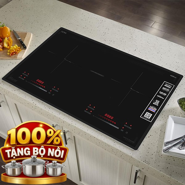 Bên cạnh đó, bếp còn được trang bị nhiều tiện ích như hẹn giờ lên đến 480 phút, giới hạn nhiệt độ tự động, chống trào, nhận diện vùng nấu và tự động ngắt khi không sử dụng hoặc khi nước tràn. Tính năng khóa bảng điều khiển giúp đảm bảo an toàn, tránh trẻ nhỏ nghịch phá.
