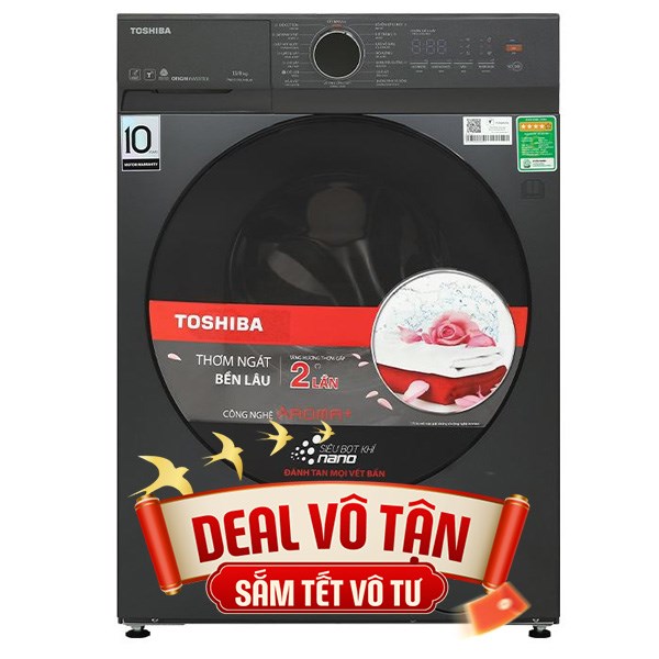 Công nghệ UFB siêu bọt khí NANO giúp chất giặt tẩy thẩm thấu sâu vào từng sợi vải, đánh bay các vết bẩn cứng đầu. Máy giặt sấy Toshiba còn tích hợp công nghệ giặt hơi nước Great Steam để diệt khuẩn và giảm nhăn quần áo, cùng chế độ Aroma+ giúp lưu giữ hương thơm bền lâu sau khi giặt.