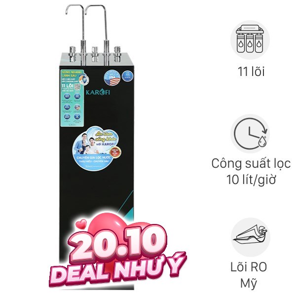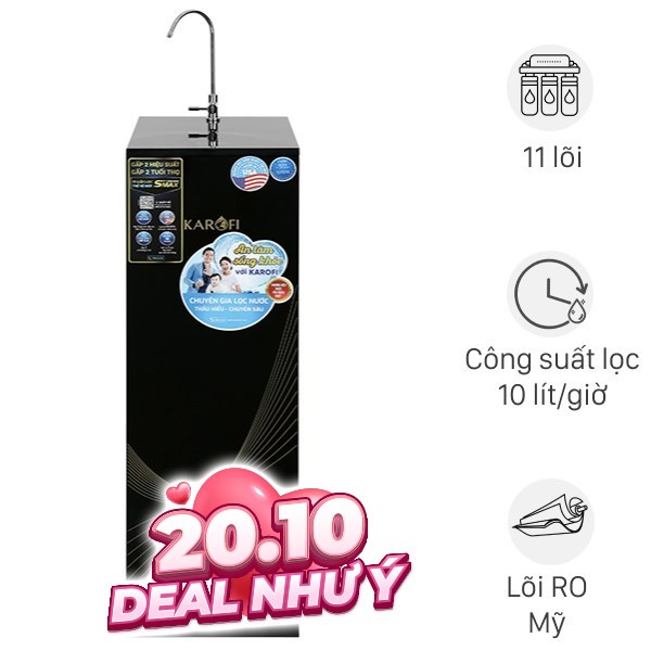 Công nghệ nổi bật của chiếc máy lọc nước Karofi này là hệ thống 11 lõi lọc Smax mạnh mẽ, giúp tăng hiệu suất và kéo dài tuổi thọ. Màng lọc RO 50 GPD sản xuất tại Mỹ là trung tâm của hệ thống, loại bỏ đến 99.99% vi khuẩn. Công nghệ kháng khuẩn Nano Silver giúp chống tái nhiễm khuẩn hiệu quả.