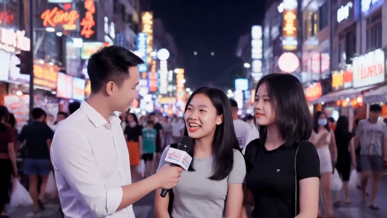 A lively night street filled with neon signs and bustling pedestrians. A Vietnamese male interviewer, dressed in a white shirt, holds a microphone and stands next to two young Japanese women, both side by side. One woman is wearing a gray T-shirt, and the other is in black. The vibrant energy of the night scene highlights their fashionable looks and the friendly atmosphere of the interview. The man holds the microphone up to the women and cheerfully asks: "Ở Việt Nam khi muốn mua điện thoại em sẽ đến đâu?". One of the girls instantly replies with a big smile and confidence: "Thế Giới Di Động chắc chắn là sự lựa chọn của em rồi, vừa chính hãng, có nhiều mẫu mã và nhân viên phục vụ tận tình". Her friend nods and laughs in agreement. The camera captures the colorful street lights and their excited expressions.