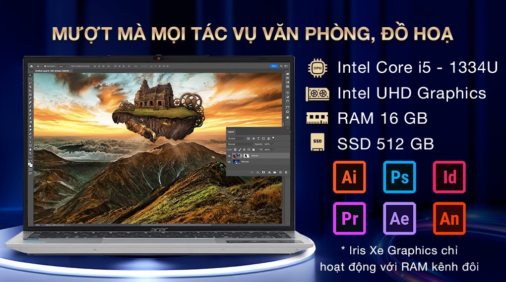 Trái tim của chiếc laptop học tập - văn phòng này là bộ vi xử lý Intel Core i5 Raptor Lake - 1334U với 10 nhân và 12 luồng, xung nhịp có thể đạt tối đa 4.6 GHz nhờ Turbo Boost. Điều này giúp máy xử lý mượt mà các tác vụ văn phòng hàng ngày như soạn thảo văn bản, duyệt web, cũng như các ứng dụng thiết kế đồ họa cơ bản. Card đồ họa tích hợp Intel UHD Graphics (Iris Xe Graphics chỉ hoạt động với RAM kênh đôi) đáp ứng tốt nhu cầu chỉnh sửa ảnh, video nhẹ nhàng.
