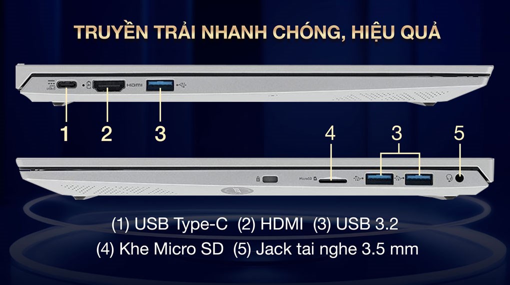 Acer Aspire Lite AL14 52M 54CJ được trang bị đầy đủ các cổng kết nối cần thiết như Jack tai nghe 3.5 mm, 3 x USB 3.2, HDMI, 1 x USB Type-C (hỗ trợ DisplayPort). Laptop Acer còn có khe đọc thẻ nhớ Micro SD, rất tiện lợi cho việc truyền tải dữ liệu từ các thiết bị khác.