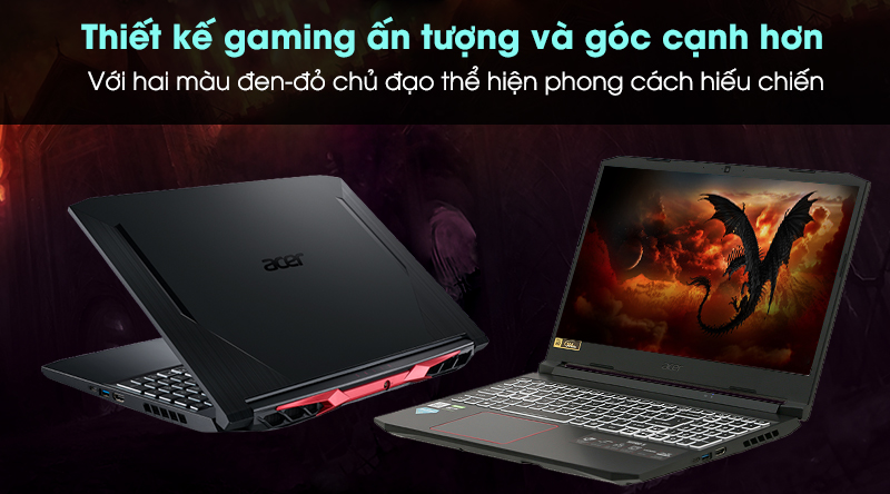 Laptop Acer Nitro sở hữu gam màu đen viền đỏ tạo nên sự tương phản kích thích ảnh nhìn, kết hợp cùng các đường nét thiết kế góc cạnh càng tạo nên sự hầm hố chuẩn gaming.