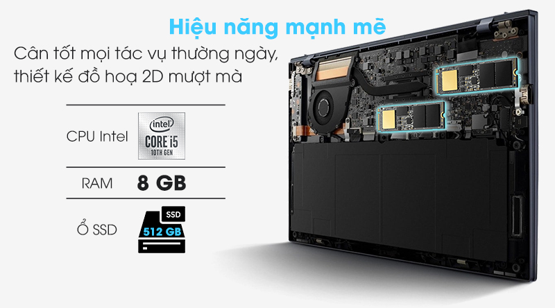 Mặc dù trọng lượng siêu nhẹ nhưng ExpertBook B9 vẫn được trang bị bộ xử lý Intel Core i5 Gen 10 mới nhất dung lượng RAM 8 GB với ổ cứng SSD 512 GB M.2 PCIe truy cập dữ liệu siêu nhanh tăng hiệu năng của máy giúp xử lý các ứng dụng văn phòng, cắt ghép video cơ bản hay chỉnh sửa hình ảnh chuyên nghiệp đều duy trì ổn định và mượt mà.