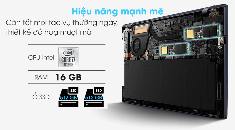 Thiết bị được trang bị bộ xử lý Intel Core i7 Gen 10 mới nhất dung lượng RAM 16 GB đem lại hiệu năng nhanh và nhạy cùng với 2 thanh ổ cứng SSD 512 GB M.2 PCIe tốc độ truy cập dữ liệu siêu nhanh và khả năng lưu trữ cực lớn giúp mở, xử lý hầu hết mọi tác vụ văn phòng và cả đồ họa chuyên nghiệp như Photoshop, Ai hay Premier.