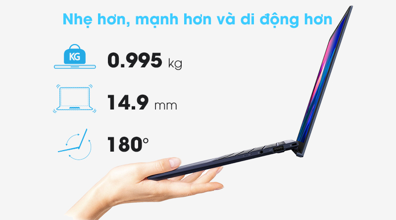 Với cân nặng 0.995 kg, Asus ExpertBook B9450F được giảm trọng lượng đến mức tối thiểu nhờ khung gầm hợp kim magie lithium bền và nhẹ nhưng cứng hơn 38% so với hợp kim nhôm-magiê truyền thống làm tăng khả năng va đập trong lúc di chuyển.