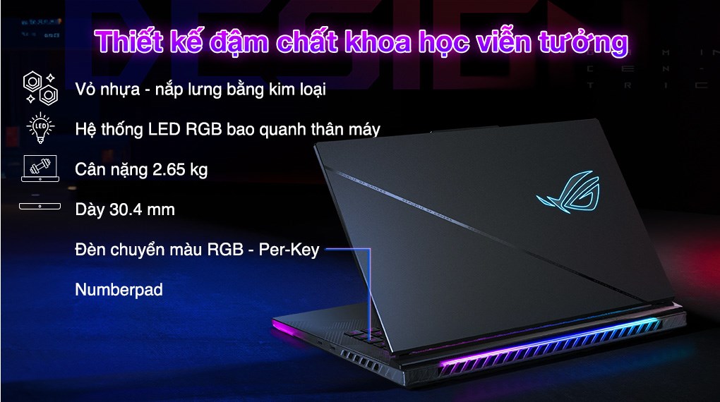 Laptop Asus ROG được chế tạo với sự tập trung đặc biệt vào các chi tiết, đặc trưng bởi chiếc logo màu nổi được đặt ở phía sau máy, tạo nên một điểm nhấn độc đáo mỗi khi bạn đặt máy ở bất kỳ đâu. Với việc sử dụng vật liệu cao cấp từ vỏ nhựa và nắp lưng bằng kim loại, sản phẩm không chỉ mang lại vẻ ngoại hình đẹp mắt mà còn tăng thêm độ chắc chắn và bền bỉ đáng kể cho toàn bộ thiết bị.