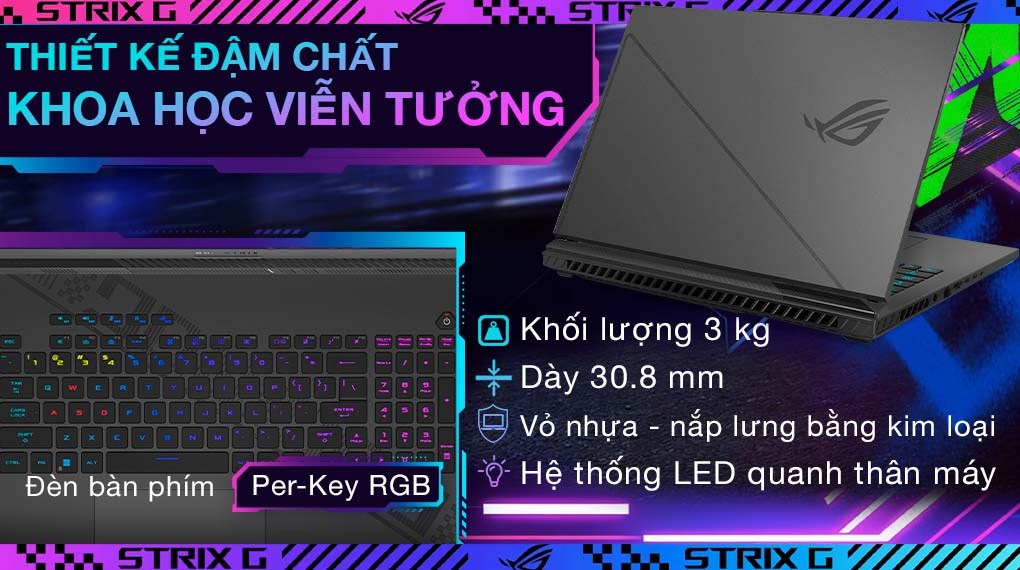 Với cái nhìn đầu tiên, không thể phủ nhận sự thu hút của vẻ ngoại hình mạnh mẽ, đậm chất gaming trên ROG Strix SCAR. Thiết kế này đặc trưng bởi các đường nét góc cạnh, tạo ra một diện mạo tinh tế và vững chắc. Lớp vỏ nhựa kết hợp cùng nắp lưng bằng kim loại không chỉ tăng thêm sự sang trọng mà còn làm cho tổng thể chiếc máy trở nên bền bỉ hơn, thể hiện tính chất đặc biệt của sản phẩm.