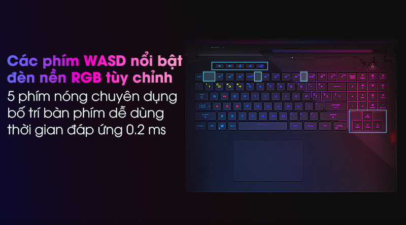 Không chỉ vậy, laptop Asus còn trang bị đèn nền được tích hợp đèn LED RGB giúp bạn dễ dàng tùy chỉnh màu bàn phím, tăng trải nghiệm chơi game cho các game thủ. Các phím chức năng giúp nhận diện trực quan và các phím nóng chuyên dụng để truy cập nhanh các lệnh thiết yếu với khoảng cách hợp lý 1.9 mm.