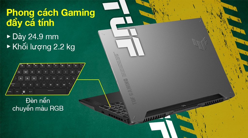 Laptop Asus TUF Gaming được tạo nên với bộ khung hầm hố và đường nét chuẩn Gaming, toát lên vẻ mạnh mẽ và cá tính. Tông màu xám thời thượng và họa tiết in chìm ở mặt A tạo điểm nhấn đặc biệt cho laptop. Với khối lượng 2.2 kg, máy vẫn rất vừa vặn, nhẹ nhàng và tiện lợi khi mang đi bạn làm việc và giải trí ở bất kỳ đâu.