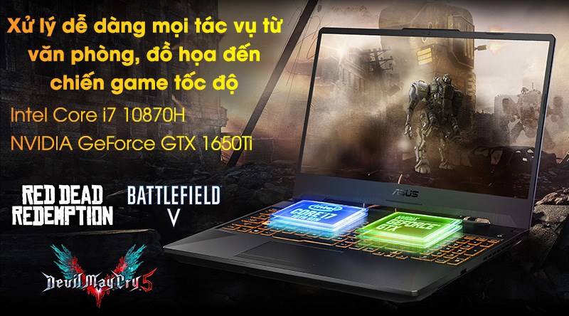 Laptop Asus TUF Gaming FX506LI trang bị cho mình chip Intel Core i7 Comet Lake thế hệ thứ 10 hiện đại có 8 nhân 16 luồng với tốc độ xung nhịp thông thường là 2.20 GHz và cho tốc độ tối đa 5.0 GHz nhờ Turbo Boost, mang đến hiệu suất và tốc độ phản hồi cao. Nhờ đó, cho bạn trải nghiệm làm việc hiệu quả đáp ứng các nhu cầu từ công việc văn phòng cơ bản đến các công việc về thiết kế đồ họa và chơi game thoải mái.