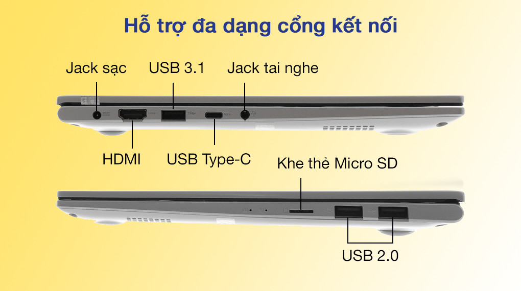 Hướng đến sự đa dụng của một chiếc máy tính hiện đại, laptop này được trang bị đa dạng các cổng kết nối thông dụng như: Micro SD, HDMI, USB 3.1, 2 x USB 2.0, USB Type-C giúp sạc và kết nối với các thiết bị ngoại vi trở nên dễ dàng hơn.