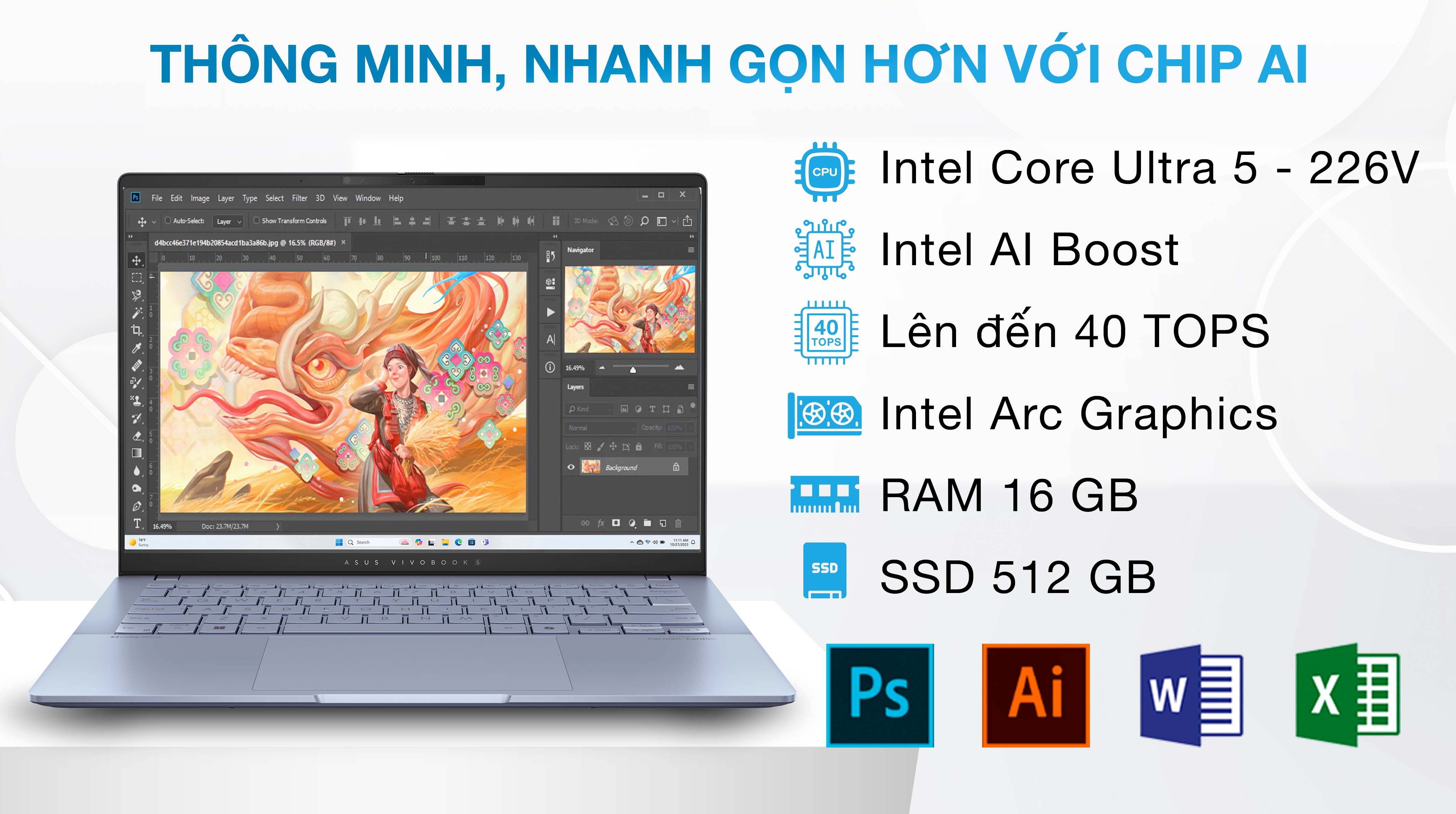 Laptop Asus VivoBook được trang bị Intel Core Ultra 5 226V, mang đến sức mạnh xử lý vượt trội nhờ công nghệ AI thông minh tích hợp. Con chip này xử lý mượt mà các ứng dụng như Photoshop, Figma,... giúp tối ưu hóa hiệu suất khi làm việc đa nhiệm. Ngoài ra, với card đồ họa Intel Arc Graphics, thiết bị đảm bảo khả năng hiển thị hình ảnh ổn định và sắc nét, hỗ trợ tốt cho các công việc sáng tạo và giải trí.