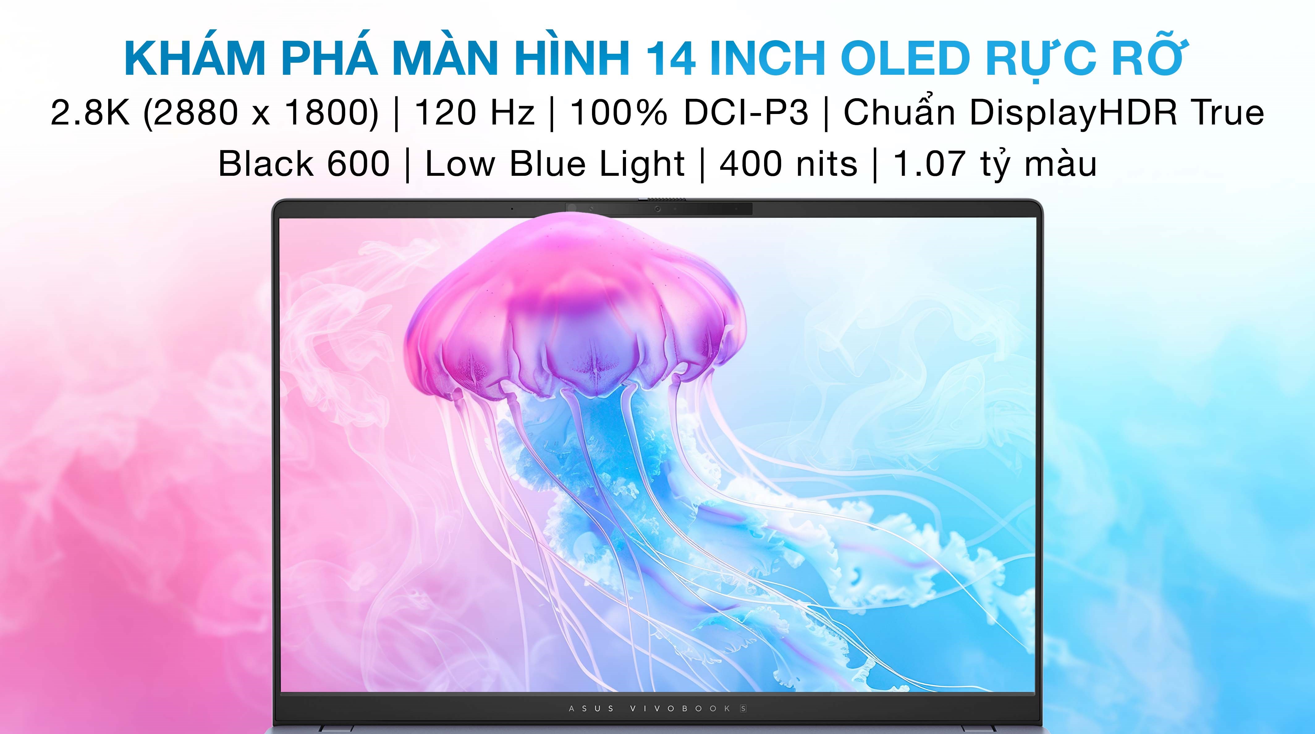 Điểm nhấn của laptop Asus chính là màn hình 14 inch OLED với độ phân giải 2.8K (2880 x 1800). Hình ảnh hiển thị sắc nét, sống động và rực rỡ nhờ công nghệ 100% DCI-P3. Đây là lựa chọn tuyệt vời cho các nhà thiết kế đồ họa hoặc những người thường xuyên làm việc với nội dung hình ảnh. Để bảo vệ mắt khi làm việc trong thời gian dài, màn hình còn tích hợp công nghệ Low Blue Light, giảm ánh sáng xanh có hại.