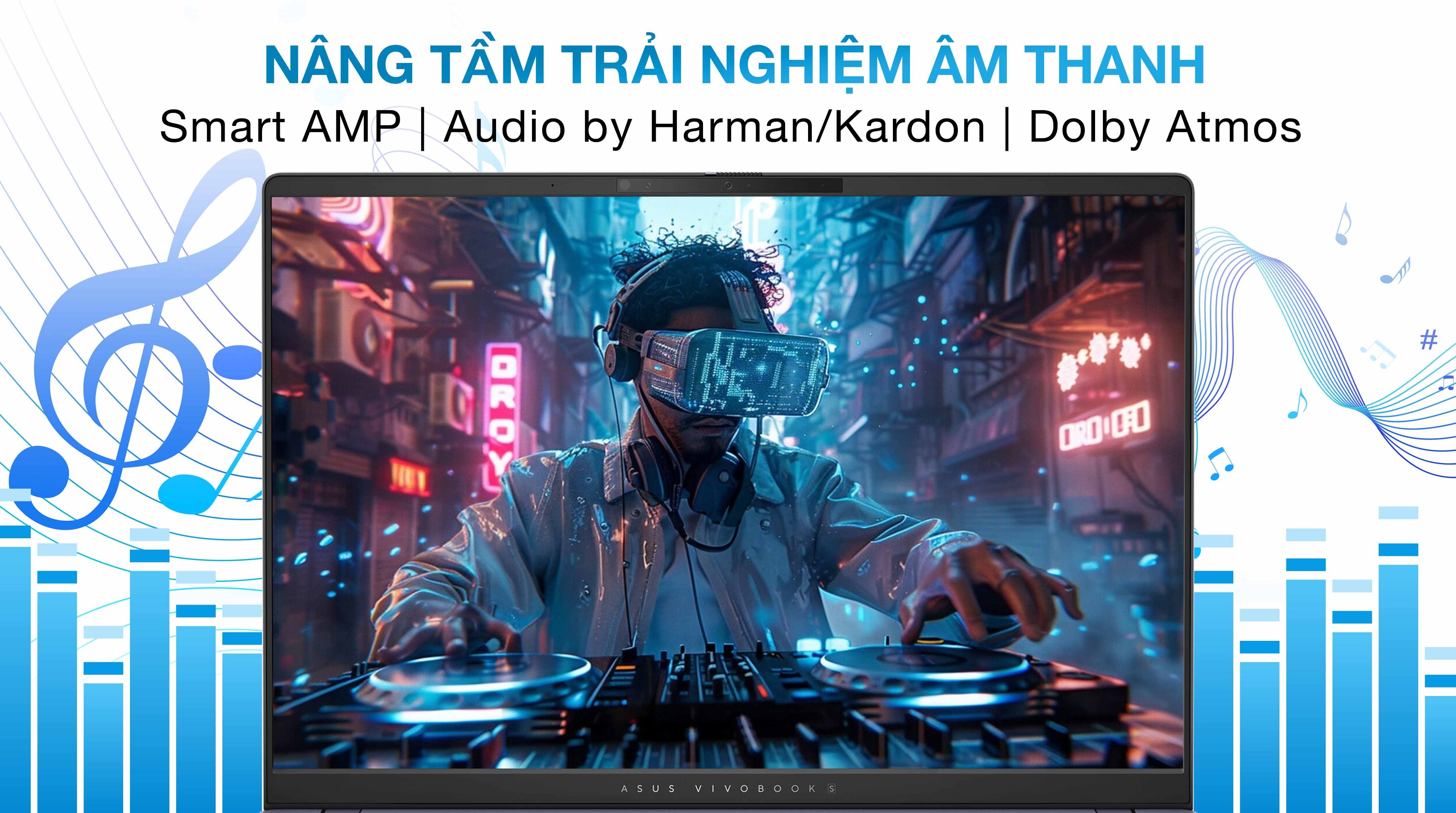 Hệ thống âm thanh của laptop được nâng tầm với công nghệ Smart AMP, mang lại âm lượng lớn mà không bị méo tiếng. Kết hợp cùng dàn loa tinh chỉnh bởi Harman/Kardon, âm thanh phát ra trở nên sống động và sắc nét, lý tưởng cho việc nghe nhạc, xem phim hoặc tham gia họp trực tuyến.