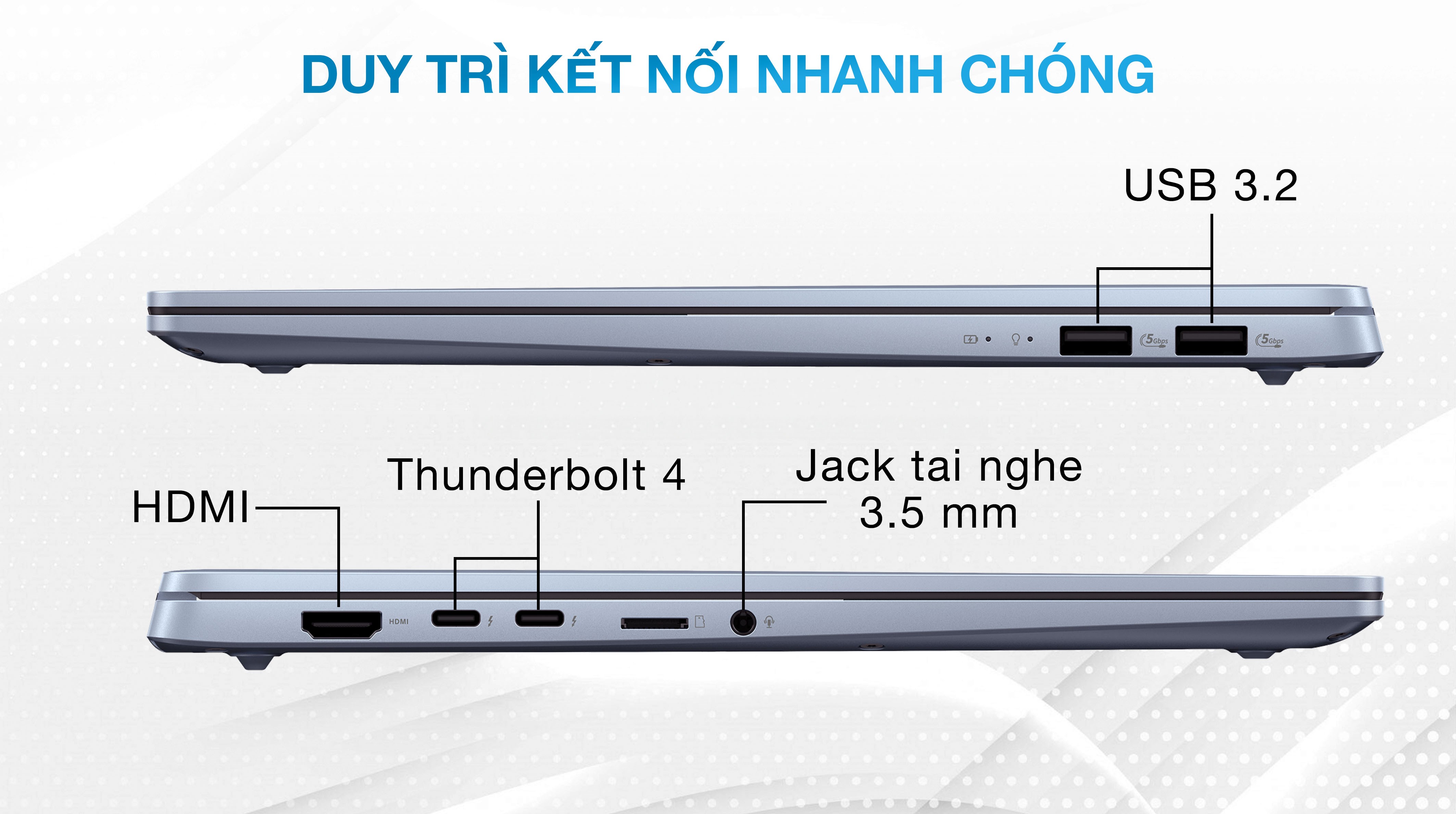 Laptop học tập - văn phòng hỗ trợ đầy đủ các cổng kết nối như Thunderbolt 4, HDMI, USB 3.2 và khe thẻ Micro SD, đảm bảo khả năng kết nối linh hoạt với nhiều thiết bị ngoại vi. Dù bạn cần trình chiếu, truyền tải dữ liệu hay kết nối với màn hình ngoài, Vivobook S 14 luôn đáp ứng hoàn hảo.