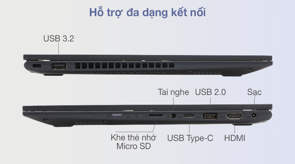 Dọc hai bên laptop Asus được trang bị các cổng kết nối thông dụng như USB 3.2, HDMI, cổng USB 2.0, USB Type-C, khe cắm Micro SD và jack tai nghe 3.5 mm, hỗ trợ người dùng dễ dàng liên kết với các thiết bị ngoại vi tương thích khác nhau.