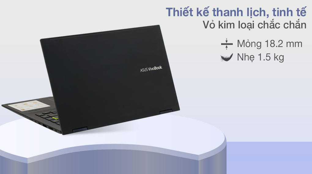 Laptop Asus Vivobook sở hữu trọng lượng 1.5 kg và dày 18.2 mm, với lớp vỏ kim loại cao cấp được bao phủ gam màu đen trung tính bên ngoài, sẵn sàng di chuyển cùng bạn đến bất kỳ đâu, đáp ứng tối đa cho mọi nhu cầu về công việc hay giải trí hàng ngày.
