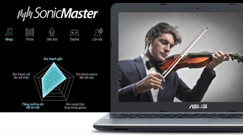 Asus X441UA được tích hợp sẵn công nghệ âm thanh SonicMaster giúp người dùng trải nghiệm được âm thanh trong trẻo, chân thực và sắc nét nhất.