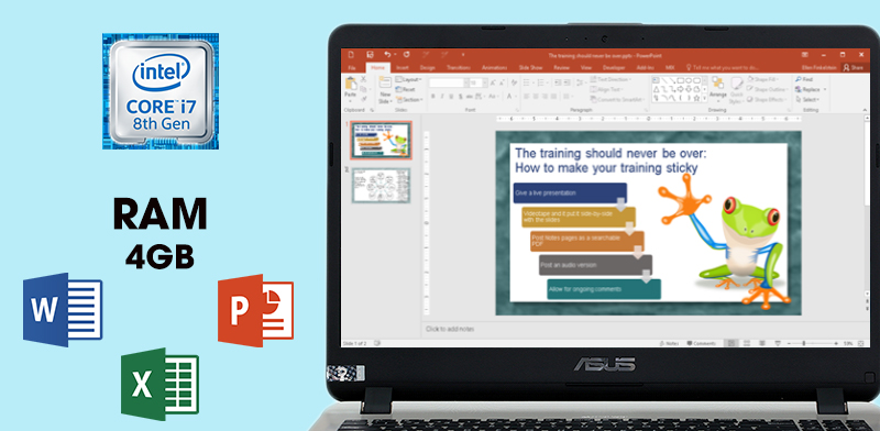 Chip Intel Core i7 thế hệ thứ 8 cùng bộ nhớ RAM 4 GB, hỗ trợ sử dụng mượt mà mọi ứng dụng giải trí thông thường và văn phòng như Word, Excel,...