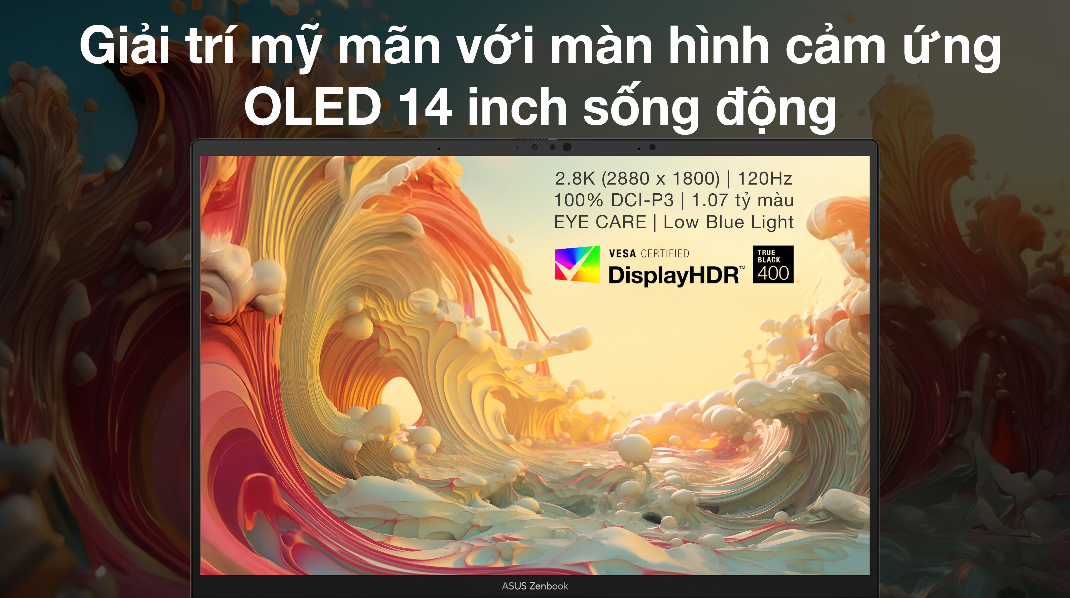 Màn hình laptop Asus là một trong những điểm sáng giá nhất của Asus Zenbook 14 UX3405CA. Kích thước 14 inch kết hợp với độ phân giải 2.8K (2880 x 1800) trên tấm nền OLED mang đến hình ảnh sắc nét đến từng chi tiết, màu sắc sống động và độ tương phản vô hạn.