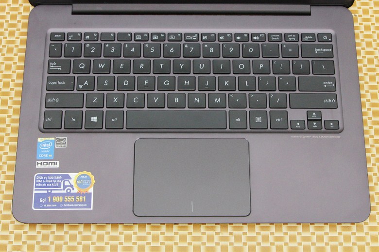 Chất lượng từ bàn phím của UX305FA ngang ngửa với các dòng Zenbook khác, kích thước phím rộng, khoảng cách phím đều, độ nãy phù hợp giúp giảm tối đa tiếng ồn khi gõ máy. Vì máy được thiết kế nhỏ gọn nên không hỗ trợ bàn phím numpad, và điều đặc biệt là nút khởi động được thiết kế chung với các phím máy tính taọ sự đồng nhất trong thiết kế. Touchpad được thiết kế to và di chuyển khá mượt mà, touchpad này có ưu điểm là được thiết kế như 1 clickpad nên bạn có thể nhấn ở mọi vị trí.