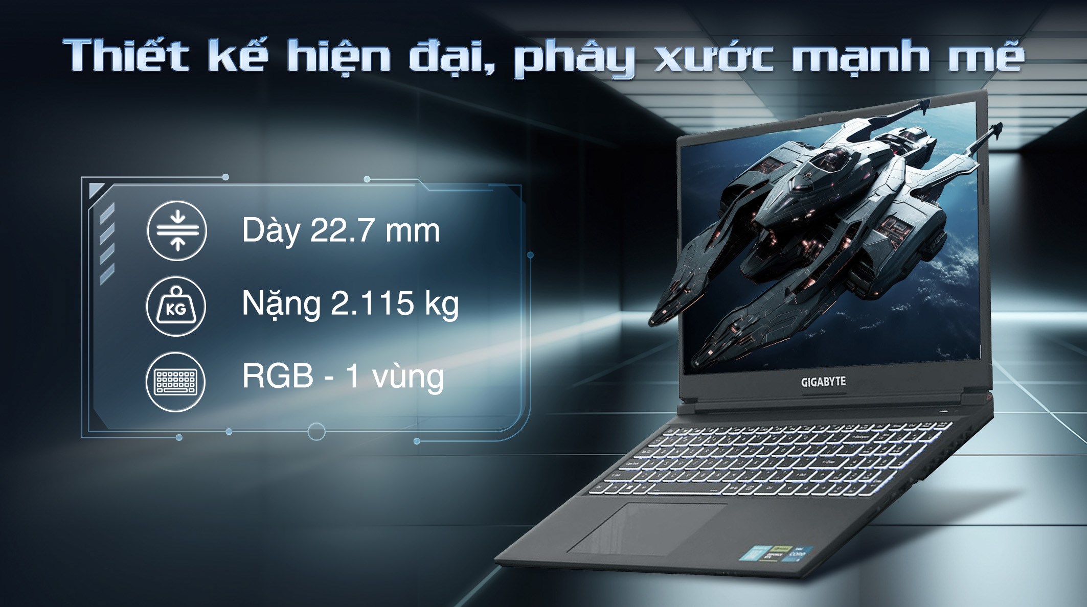 GIGABYTE G5 MF5 sở hữu thiết kế đậm chất gaming với vỏ nhựa chắc chắn. Máy có kích thước dày 22.7 mm và khối lượng 2.115 kg, khá gọn nhẹ so với nhiều mẫu laptop gaming khác, thuận tiện cho việc di chuyển. Bàn phím được trang bị đèn chuyển màu RGB 1 vùng, tạo điểm nhấn thẩm mỹ và giúp bạn sử dụng máy trong điều kiện thiếu sáng. Đèn RGB cũng góp phần tăng thêm không khí hứng khởi khi chơi game. Tổng thể, thiết kế của chiếc laptop GIGABYTE này hướng đến sự bền bỉ và hiệu quả tản nhiệt để duy trì hiệu năng ổn định khi hoạt động cường độ cao.