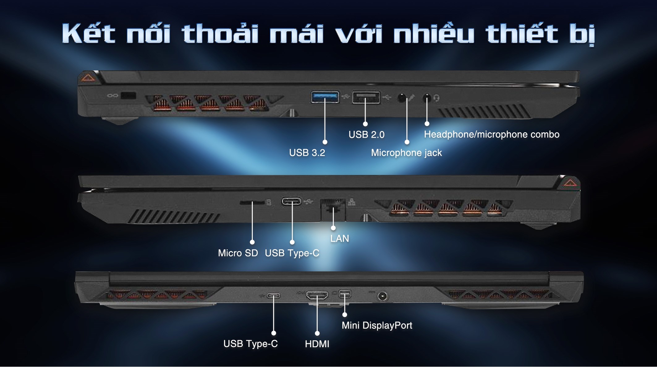 GIGABYTE G5 MF5 được trang bị đầy đủ các cổng kết nối phổ biến, đáp ứng mọi nhu cầu kết nối thiết bị ngoại vi. Bao gồm Mini DisplayPort, 1 x USB 2.0, 1 x USB 3.2, HDMI, jack Microphone riêng, jack Headphone/microphone combo, cổng mạng LAN (RJ45) và đặc biệt là 2 cổng USB Type-C tiện lợi. Khe đọc thẻ nhớ Micro SD cũng là điểm cộng cho những người cần chuyển dữ liệu từ máy ảnh hoặc điện thoại.