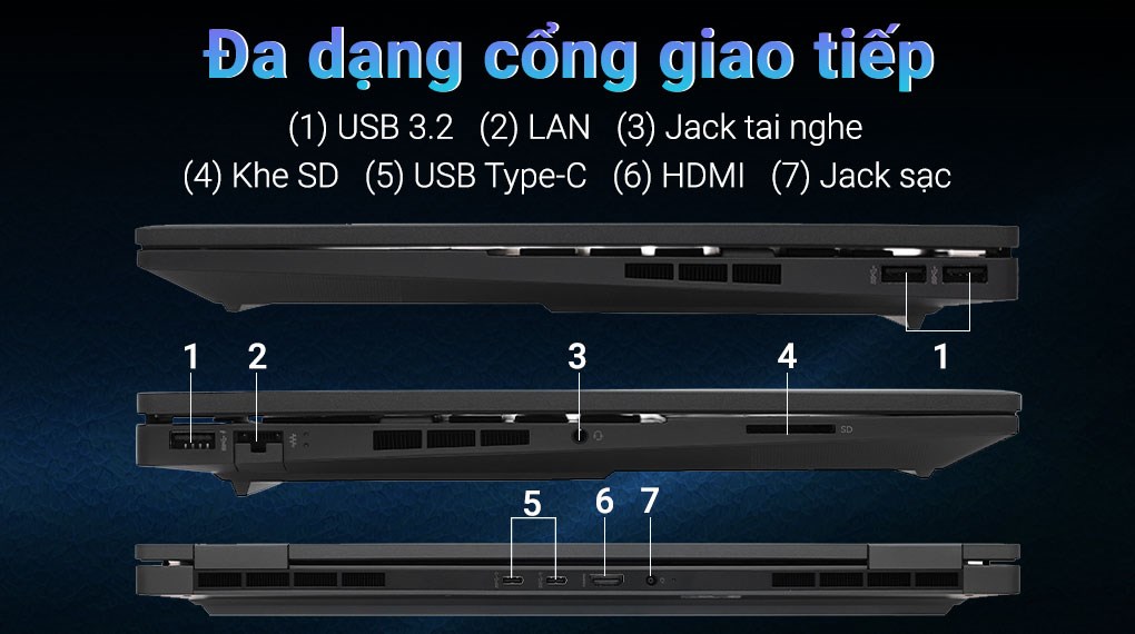 Ngoài ra, laptop còn được tích hợp với nhiều cổng giao tiếp phổ biến như HDMI, Jack tai nghe 3.5 mm, USB 3.2, LAN (RJ45) và USB Type-C để đáp ứng nhu cầu kết nối của người dùng.