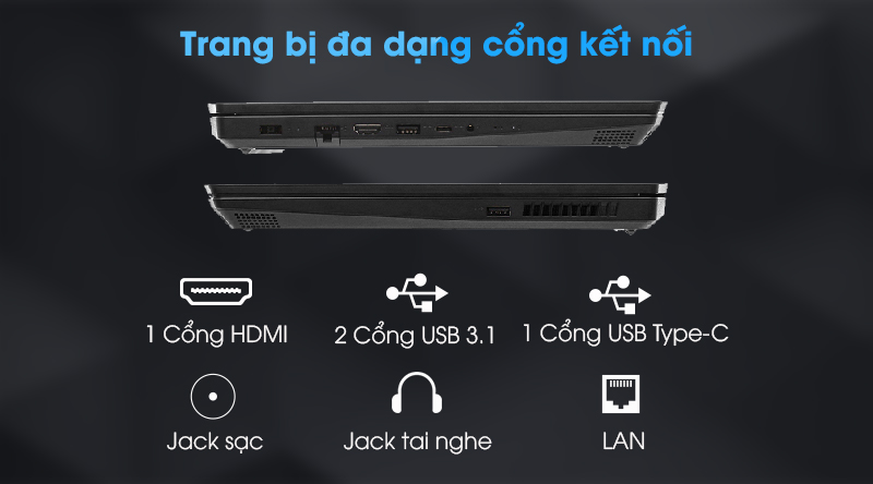 Laptop có đầy đủ các loại cổng kết nối HDMI, LAN, USB 3.1 và USB Type-C để truyền dữ liệu nhanh, đầu ra video và nhiều tính năng khác.