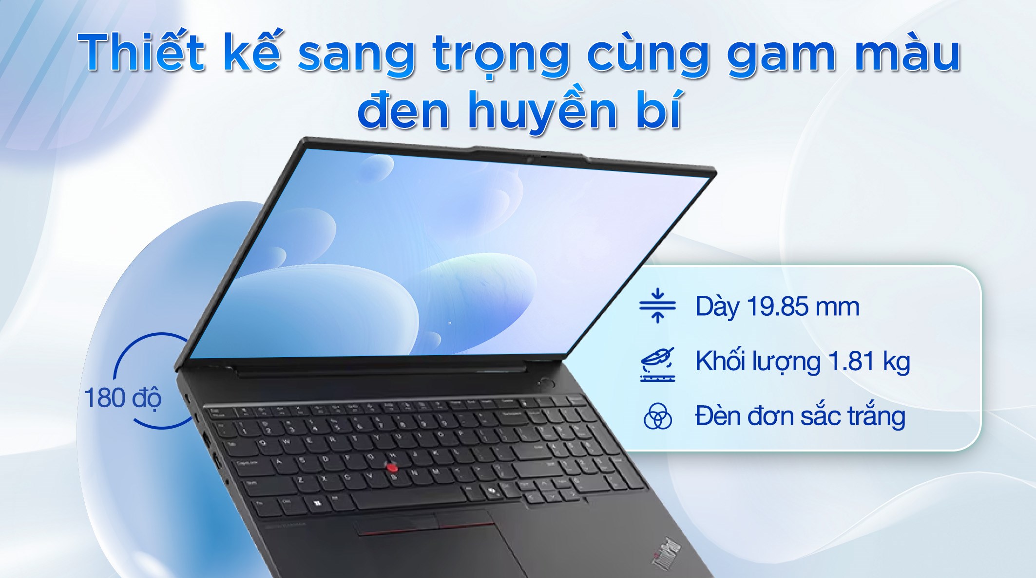Vỏ máy làm từ hợp kim nhôm, mang lại vẻ ngoài tinh tế và sang trọng. Máy đạt chuẩn quân đội MIL STD 810H, đảm bảo khả năng chống va đập và hoạt động ổn định trong môi trường khắc nghiệt. Nặng 1.81 kg, Lenovo ThinkPad E16 mang đến sự cân bằng hoàn hảo giữa tính di động và độ bền chắc. Không chỉ gọn nhẹ, chiếc laptop này còn sở hữu độ bền ấn tượng, sẵn sàng đồng hành cùng bạn vượt qua mọi thử thách công việc hàng ngày.