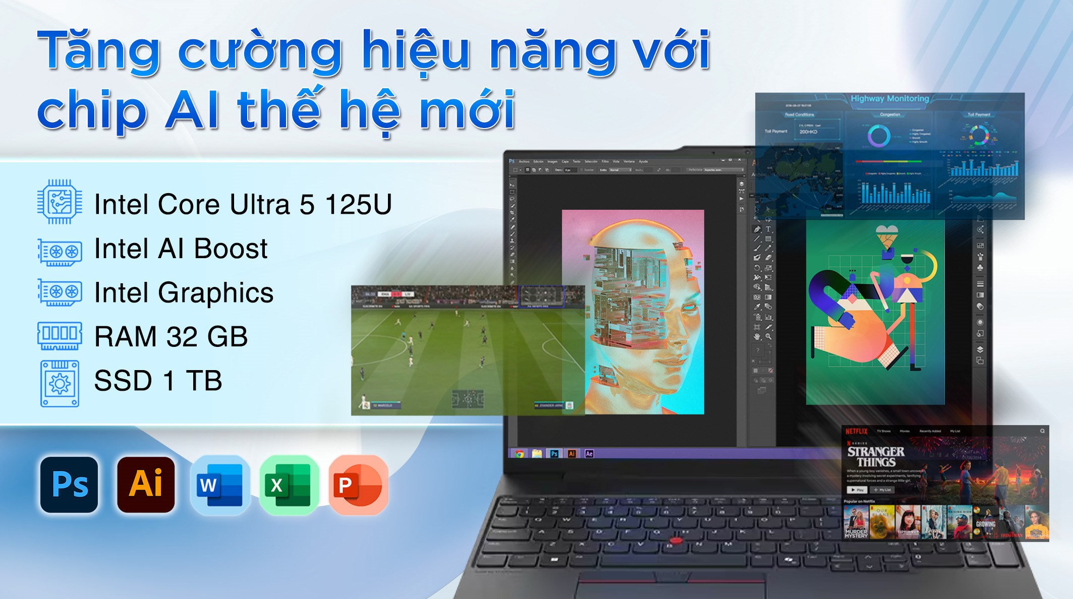 Bộ nhớ RAM DDR5 dung lượng 32 GB giúp laptop vận hành mượt mà ngay cả khi mở nhiều ứng dụng nặng cùng lúc. Máy còn hỗ trợ nâng cấp RAM lên tới 64 GB, mang đến sự linh hoạt để đáp ứng nhu cầu công việc ngày càng cao trong tương lai. Sử dụng ổ cứng SSD 1 TB chuẩn NVMe PCIe Gen 4, Lenovo ThinkPad E16 mang lại tốc độ đọc/ghi dữ liệu vượt trội. Hệ điều hành, ứng dụng hay các tệp tin lớn đều được xử lý nhanh chóng, giúp tiết kiệm thời gian và nâng cao hiệu quả công việc.