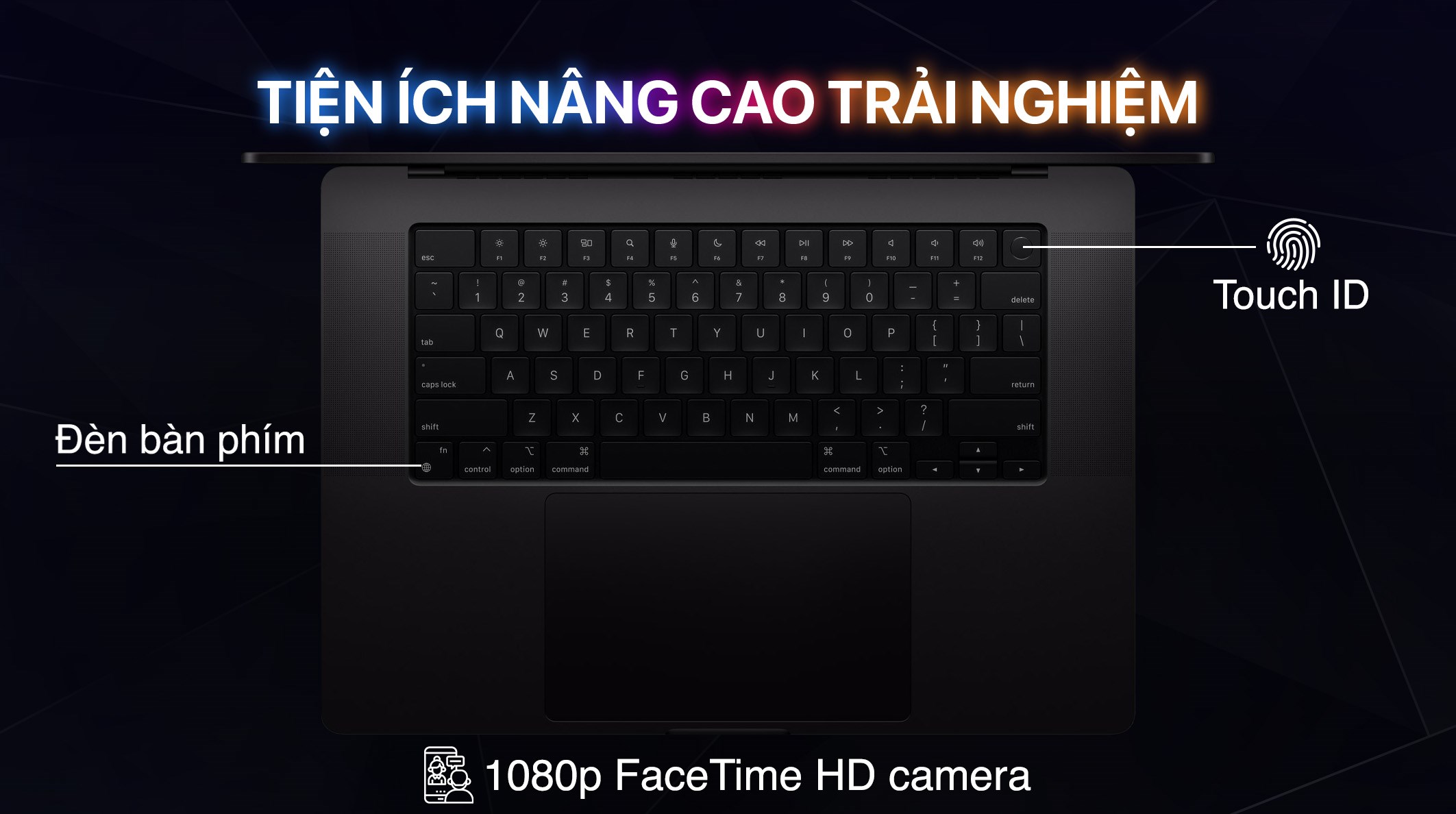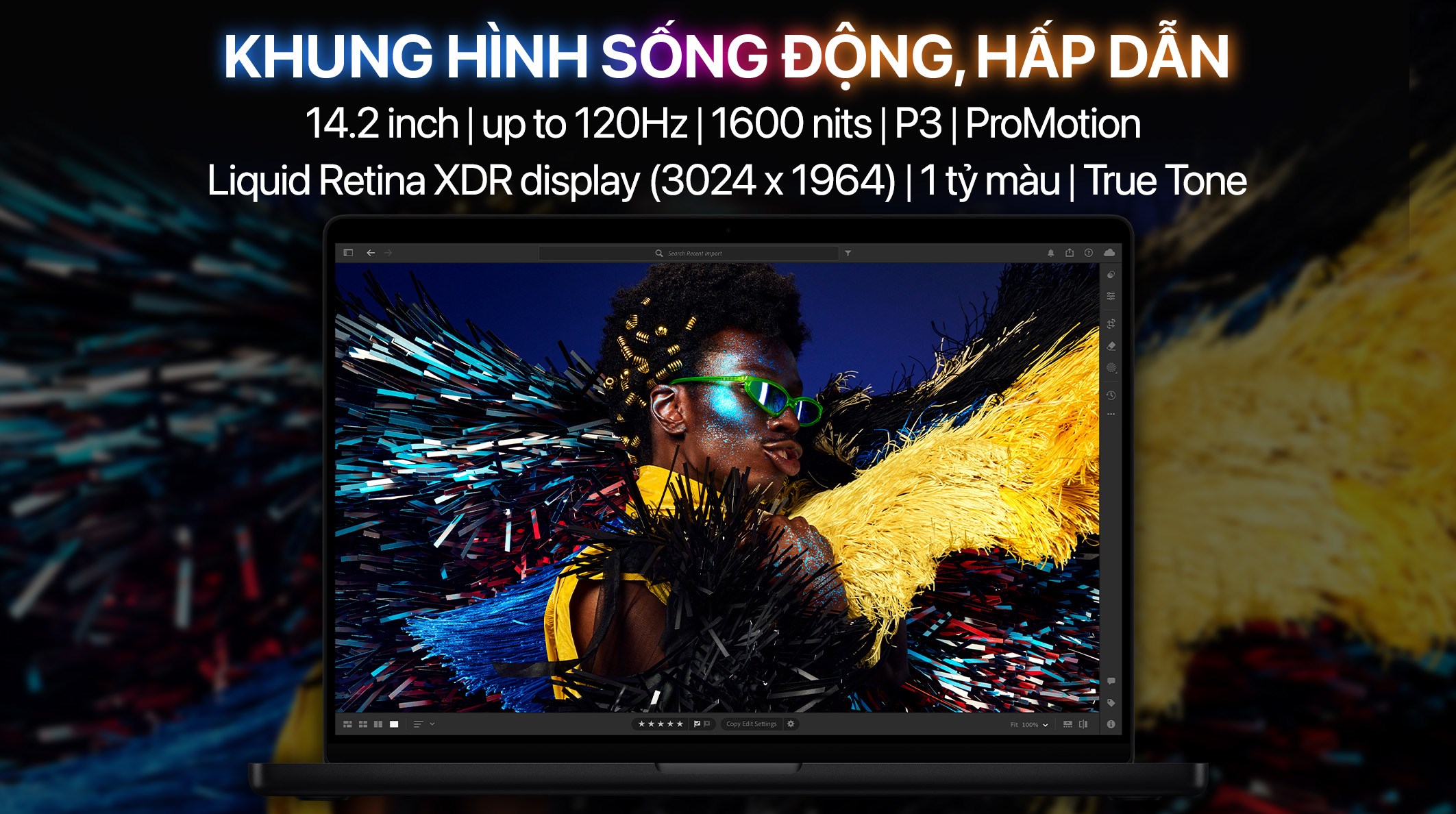 Độ sáng XDR lên đến 1000 nits toàn màn hình và 1600 nits cho nội dung HDR, cùng khả năng hiển thị 1 tỷ màu và dải màu rộng P3, đảm bảo màu sắc chính xác tuyệt đối, độ tương phản sâu và chi tiết vượt trội. Công nghệ True Tone tự điều chỉnh cân bằng trắng theo môi trường xung quanh, giúp mắt bạn luôn dễ chịu khi làm việc trong thời gian dài. Đây thực sự là một lựa chọn hàng đầu cho những ai tìm kiếm một chiếc laptop đồ hoạ chuyên nghiệp.