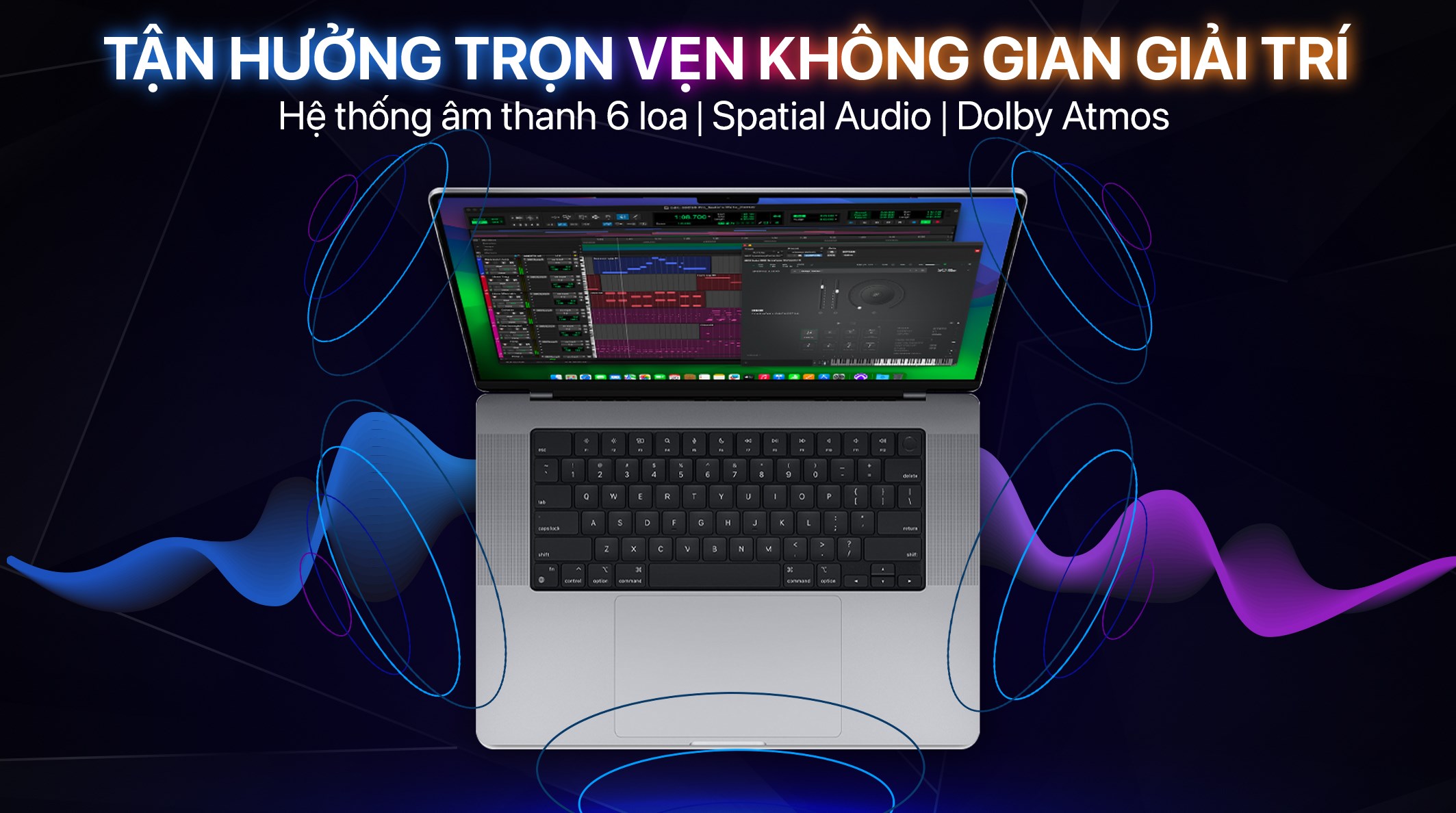 Không chỉ mạnh về hiệu năng và hình ảnh, trải nghiệm âm thanh trên Macbook Pro M4 Pro cũng được nâng tầm. Hệ thống 6 loa với công nghệ Spatial Audio và Dolby Atmos tạo ra không gian âm thanh ba chiều sống động, chi tiết, dù bạn đang nghe nhạc, xem phim hay tham gia họp trực tuyến. Ba micro chuẩn studio đảm bảo thu âm giọng nói rõ ràng, loại bỏ tạp âm hiệu quả. Webcam FaceTime HD 1080p cho chất lượng hình ảnh sắc nét khi gọi video.