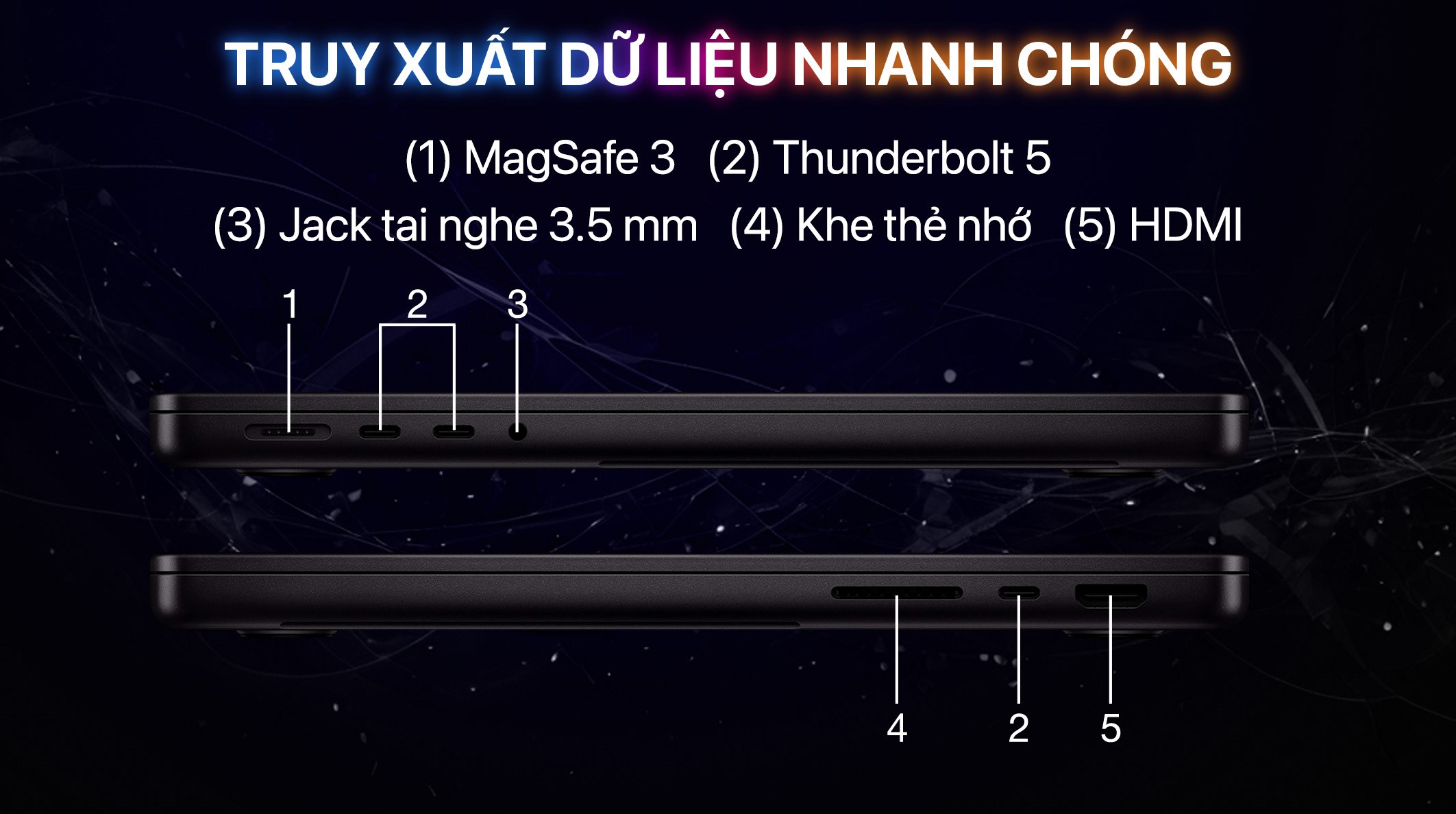 Để đáp ứng nhu cầu kết nối đa dạng của người dùng chuyên nghiệp, chiếc laptop này được trang bị đầy đủ các cổng cần thiết. Bạn sẽ có 3 cổng Thunderbolt 5 (USB-C) tốc độ cao hỗ trợ sạc, xuất màn hình và truyền dữ liệu lên đến 40Gb/s, cổng HDMI để kết nối máy chiếu hoặc màn hình ngoài, khe đọc thẻ nhớ SD tiện lợi cho nhiếp ảnh gia và nhà quay phim, jack tai nghe 3.5 mm và cổng sạc MagSafe 3 an toàn, tiện dụng.