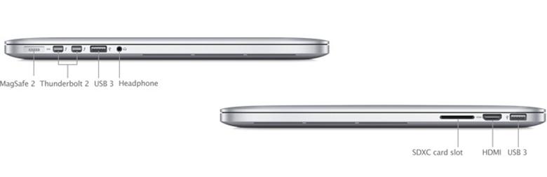 Sản phẩm được tích hợp 2 cổng USB 3.0 cùng với các cổng HDMI, LAN, MagSafe 2, Thunderbolt 2, khe đọc thẻ SDXC giúp kết nối máy với các thiết bị ngoại vi. Ngoài ra còn có kết nối không dây bluetooth 4.0 và kết nối wifi 802.11a/c hỗ trợ truy cập internet mọi lúc mọi nơi.