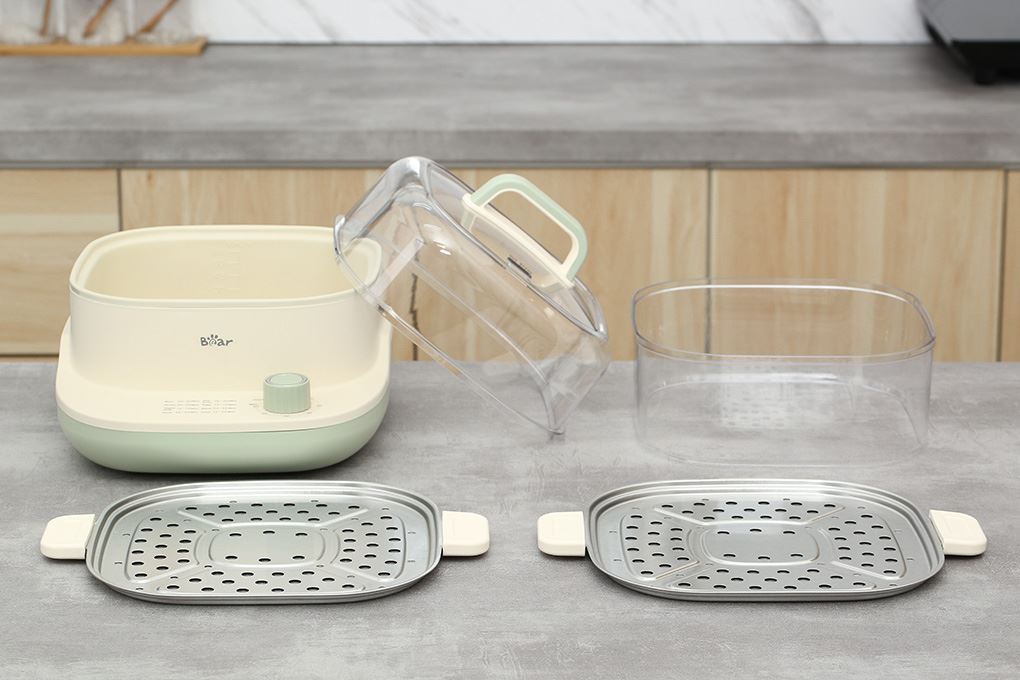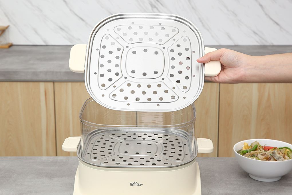 - Với tông màu be trang nhã, tinh tế, nồi lẩu hấp đa năng Bear dễ dàng kết hợp với nhiều không gian phòng bếp khác nhau. Sản phẩm có thiết kế khá nhỏ gọn nên bạn có thể đặt trên bàn ăn gia đình.