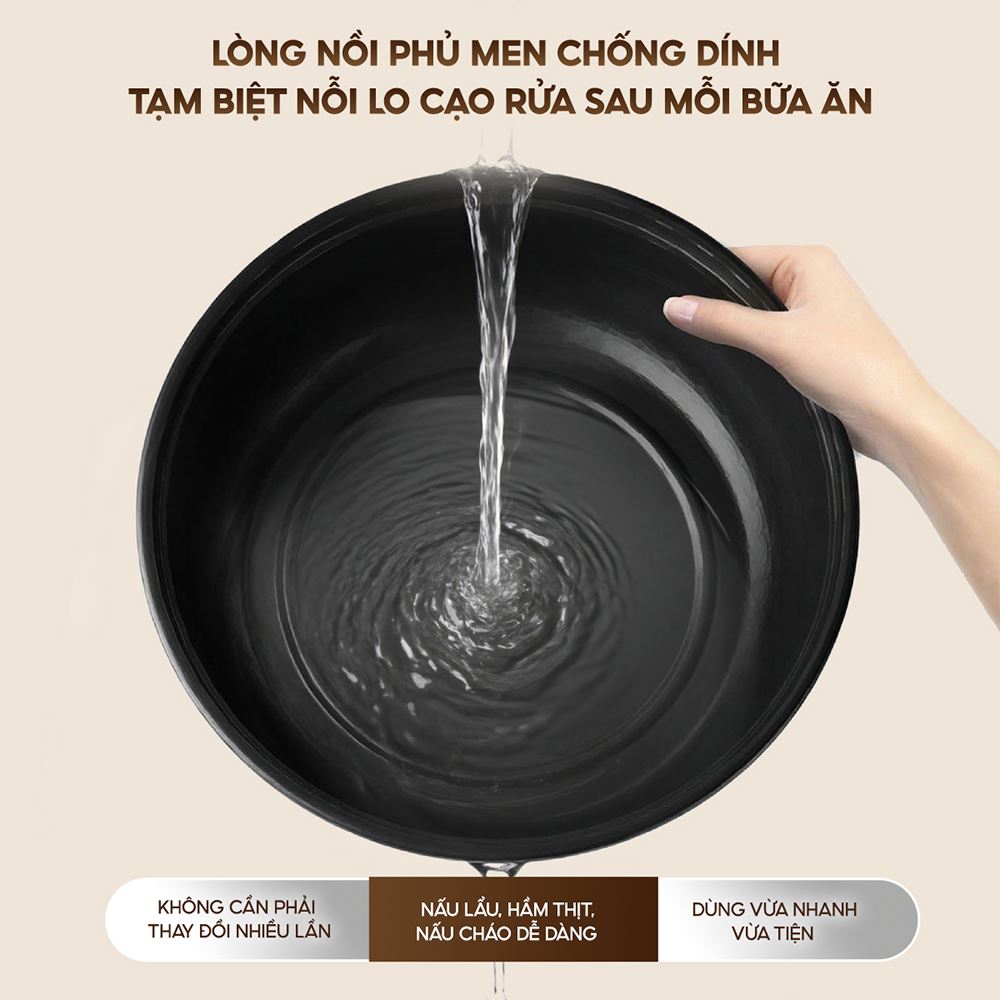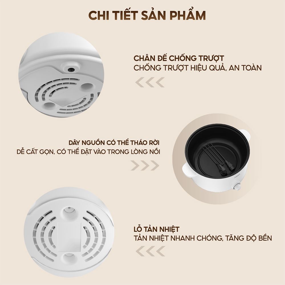 Sản phẩm còn được trang bị nhiều tiện ích giúp nâng cao trải nghiệm sử dụng: dây điện có thể tháo rời thuận tiện cho việc cất giữ và di chuyển, lỗ tản nhiệt ở thân nồi giúp thiết bị hoạt động ổn định, bền bỉ hơn, chân đế chống trượt đảm bảo nồi luôn vững chắc trên mọi bề mặt, tăng cường an toàn khi sử dụng.